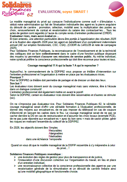 Solidaires Finances Publiques était là pour distribuer un tract rappelant l'importance de l'évaluation pour les promotions (par liste d'aptitude et tableau d'avancement), le recrutement au choix et la rémunération de certains cadres.