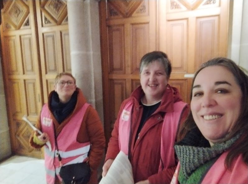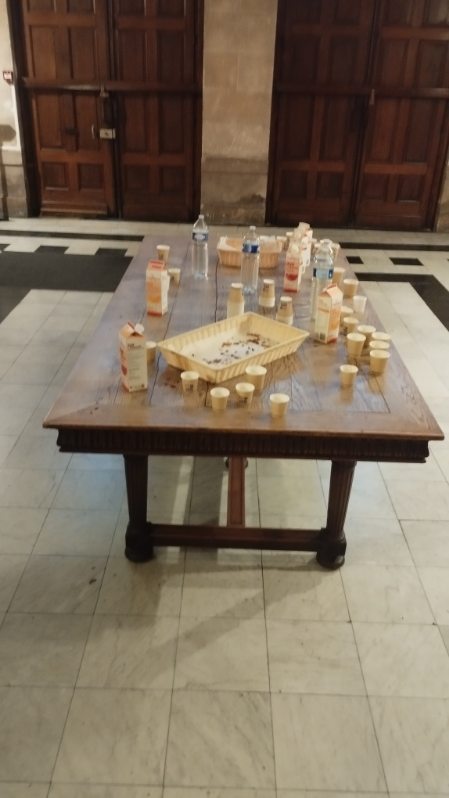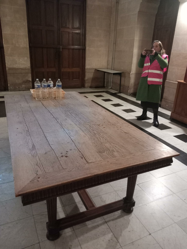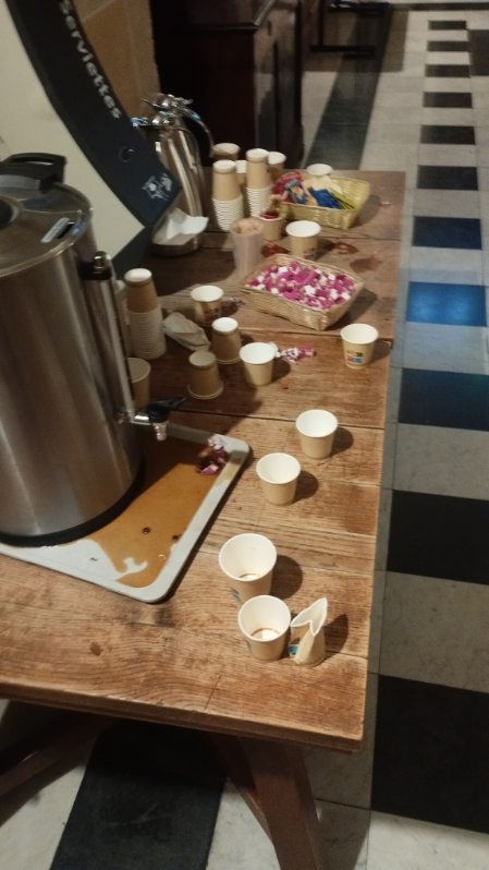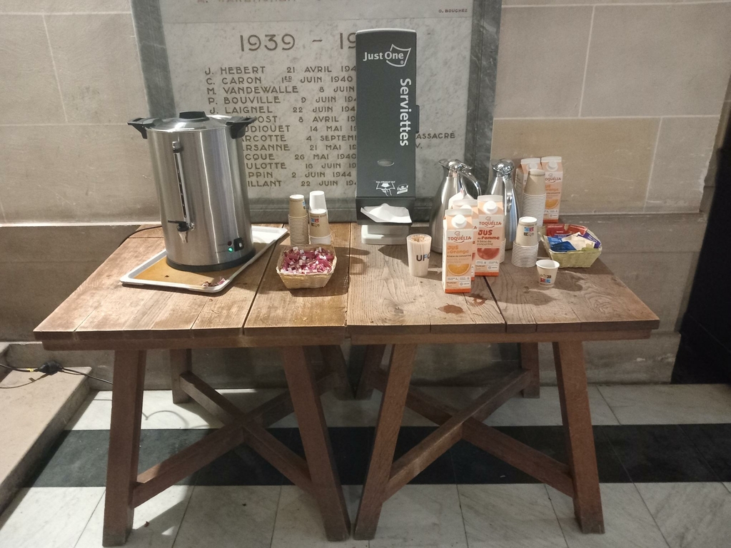 Nous étions également là pour débarrasser le champ de bataille laissé par nos encadrant·es après l'accueil café. Des éco-cups leur avaient été remises lors d'un précédent collège des Chef·fes de service sur le thème de l'écologie, il faut croire que le message est peu passé puisque nous avons pu constater que très très peu de chef·fes avaient pensé à l'apporter et à l'utiliser. Merci à elles et eux. Comme nous sommes solidaires, nous avons jeté les déchets et regrouper les restes, pour éviter une tâche à des employé·es du lieu.