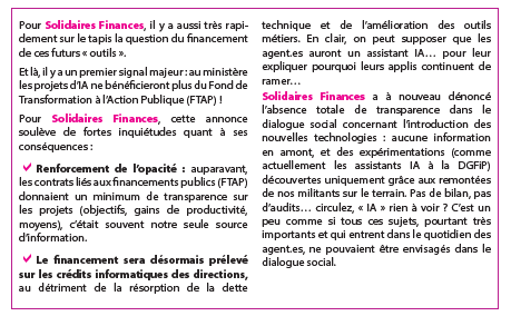 Une réunion s’est tenue sur le sujet concerné. Trois axes étaient au menu : la stratégie ministérielle IA, l’étude impact IA sur métiers du contrôle et la Qualité de vie - Conditions de Travail (QVCT). Solidaires Finances a alerté sur le fait que traiter ces deux (vastes) sujets IA et QVCT en 1/2 journée était impossible. Au final, le sujet de la QVCT sera abordé ultérieurement dans le cadre d’une Formation Spécialisée Ministérielle.